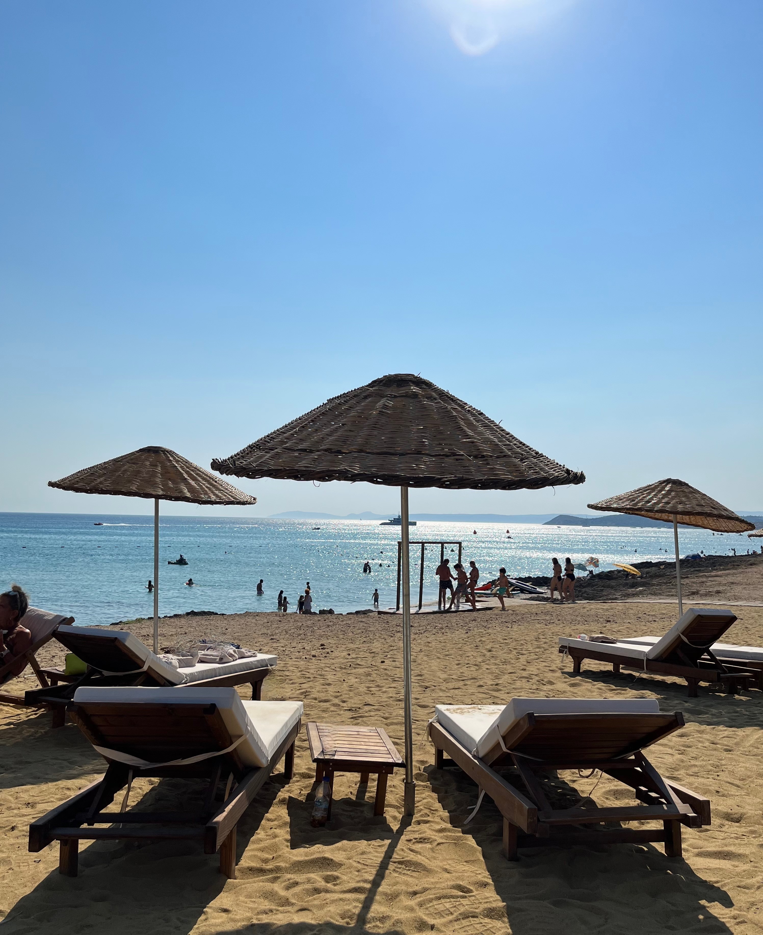 Two villages within twenty minutes. Alaçatı: cobblestone lanes, whitewashed houses trimmed in blue, cafés that serve Turkish breakfast until noon. Urla: less polished, more working. Both host weekly markets. The region is known for small-batch wine — volcanic soil, indigenous grapes, producers who work by hand. Tastings can be arranged. So can introductions to ceramicists, weavers, olive oil pressers.