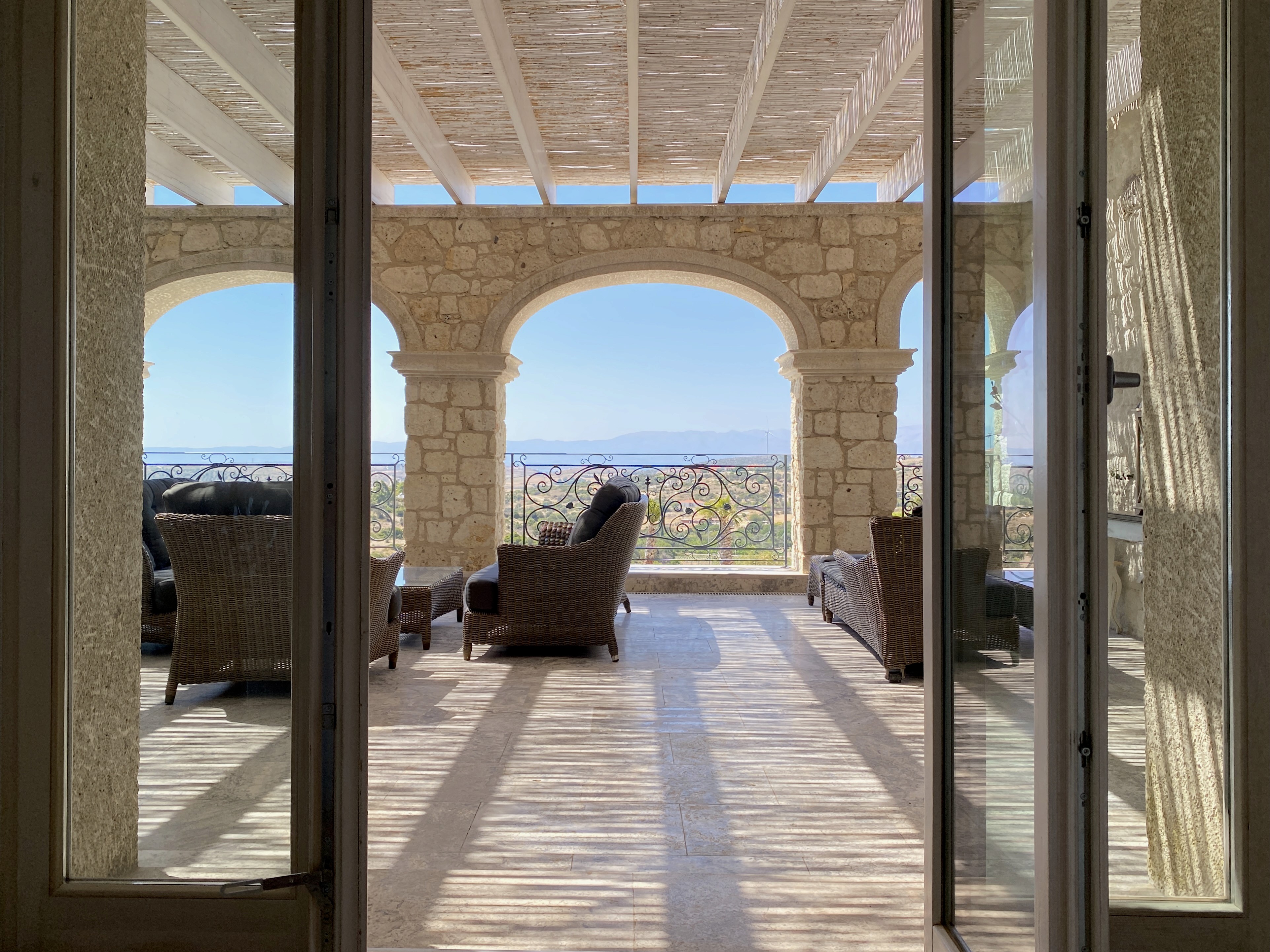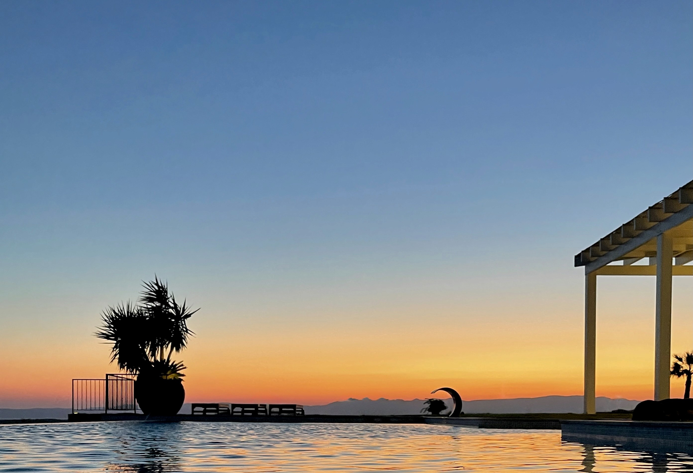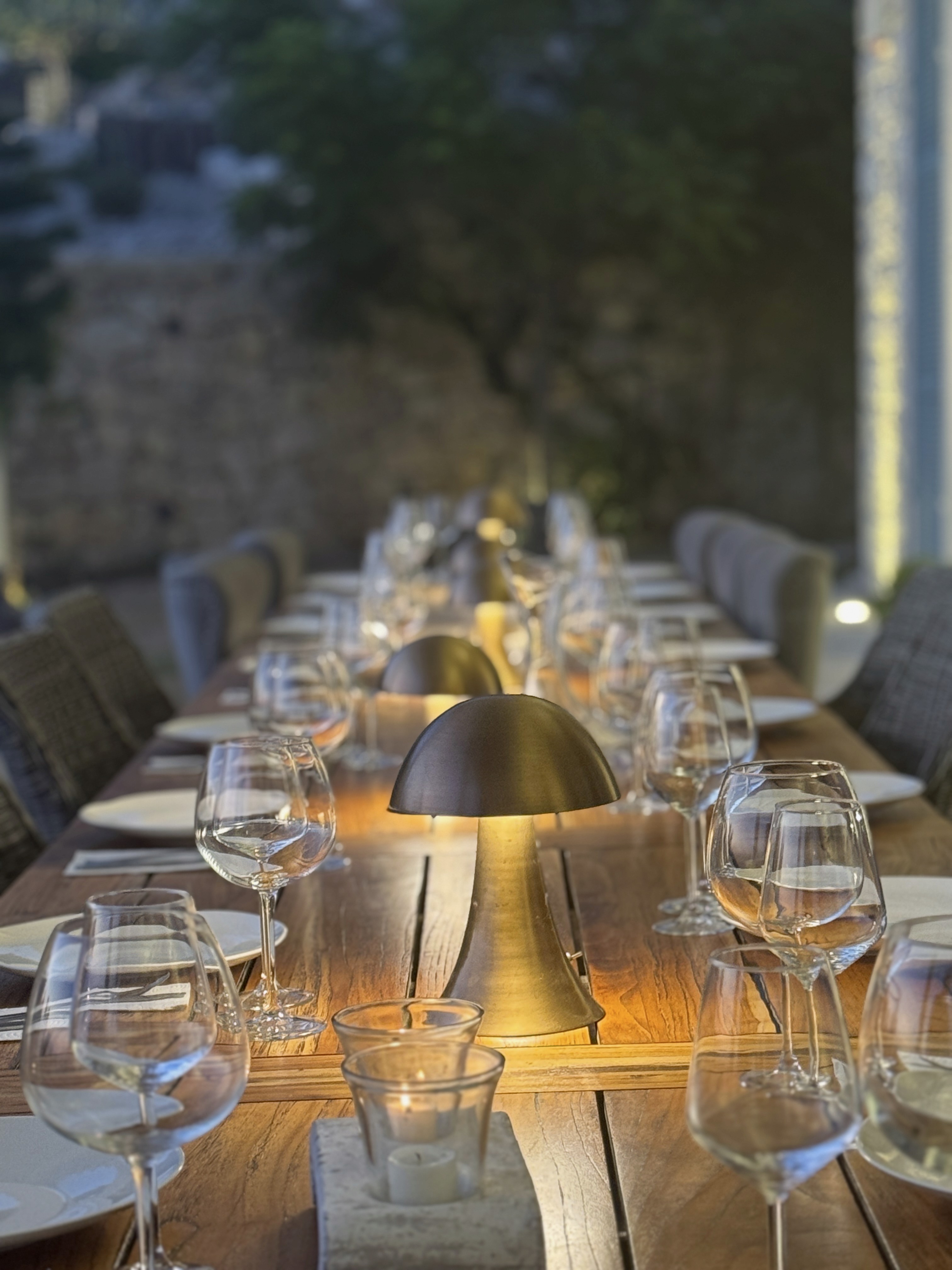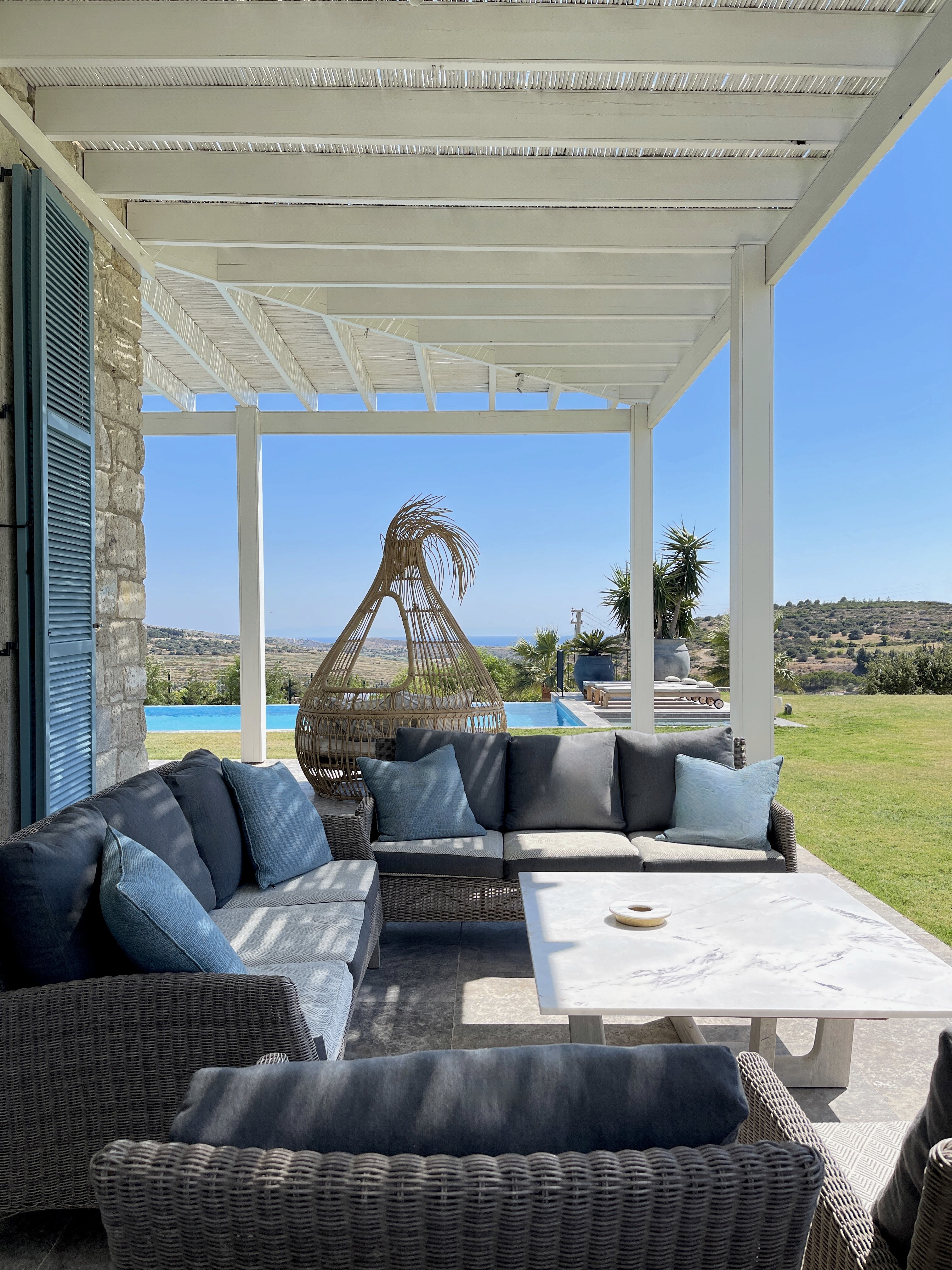 Multiple stone terraces descend toward the pool. Each offers a different relationship to sun, shade, and wind. Meals are taken outdoors whenever possible under pergolas, beside the wood-fired oven, or at the long teak table built to seat sixteen. Furniture is designed to weather. Cushions invite lingering.